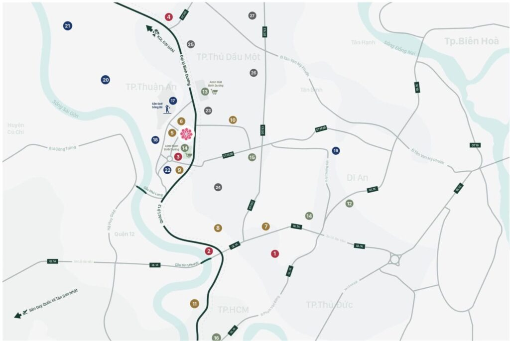 Vị trí của căn hộ Setia Edenia nổi bật nhờ nằm ngay trung tâm huyện Lái Thiêu, tỉnh Bình Dương – một khu vực đang phát triển nhanh chóng về hạ tầng và nhà ở. Với địa thế tiếp giáp nhiều tuyến đường lớn, cư dân dễ dàng kết nối đến TP. Hồ Chí Minh thông qua các trục đường huyết mạch như Quốc lộ 13, đường Võ Văn Vân và các tuyến đường chính xuyên suốt khu vực. Điều này giúp cư dân thuận tiện di chuyển đến trung tâm thành phố, các khu công nghiệp, sân bay Long Thành và các tỉnh lân cận thuộc khu vực Đông Nam Bộ.