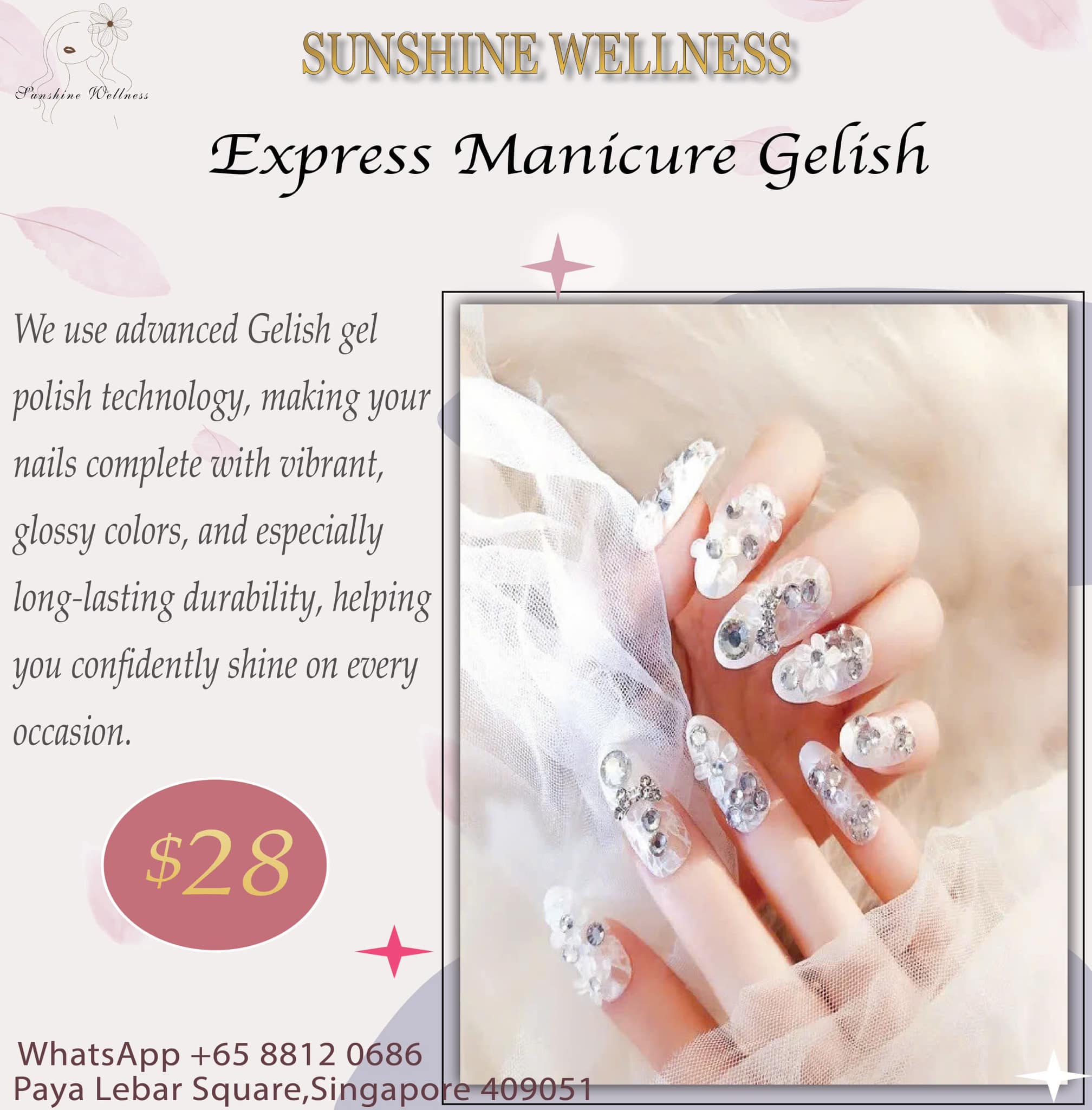Bên cạnh các dịch vụ chăm sóc da, Sunshine Wellness SG còn cung cấp dịch vụ Express Manicure Gelish – giải pháp nhanh chóng cho những ai muốn có bộ móng hoàn hảo mà không tốn quá nhiều thời gian. Với công nghệ sơn gel hiện đại, bộ móng của bạn sẽ bền màu và sáng bóng suốt nhiều tuần mà không sợ bị bong tróc.